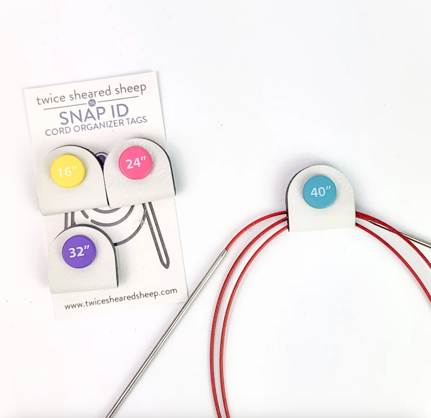 Tout simple, mais tout intelligent: un tissu style cuirette surmonté d'un bouton pression pour bien identifier les longueurs de câble de vos aiguilles circulaires.