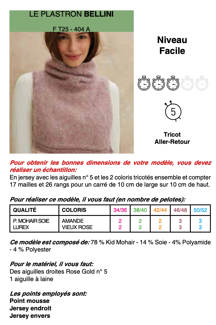 Patron du plastron Bellini de Phildar, explications en français, niveau facile, au tricot.