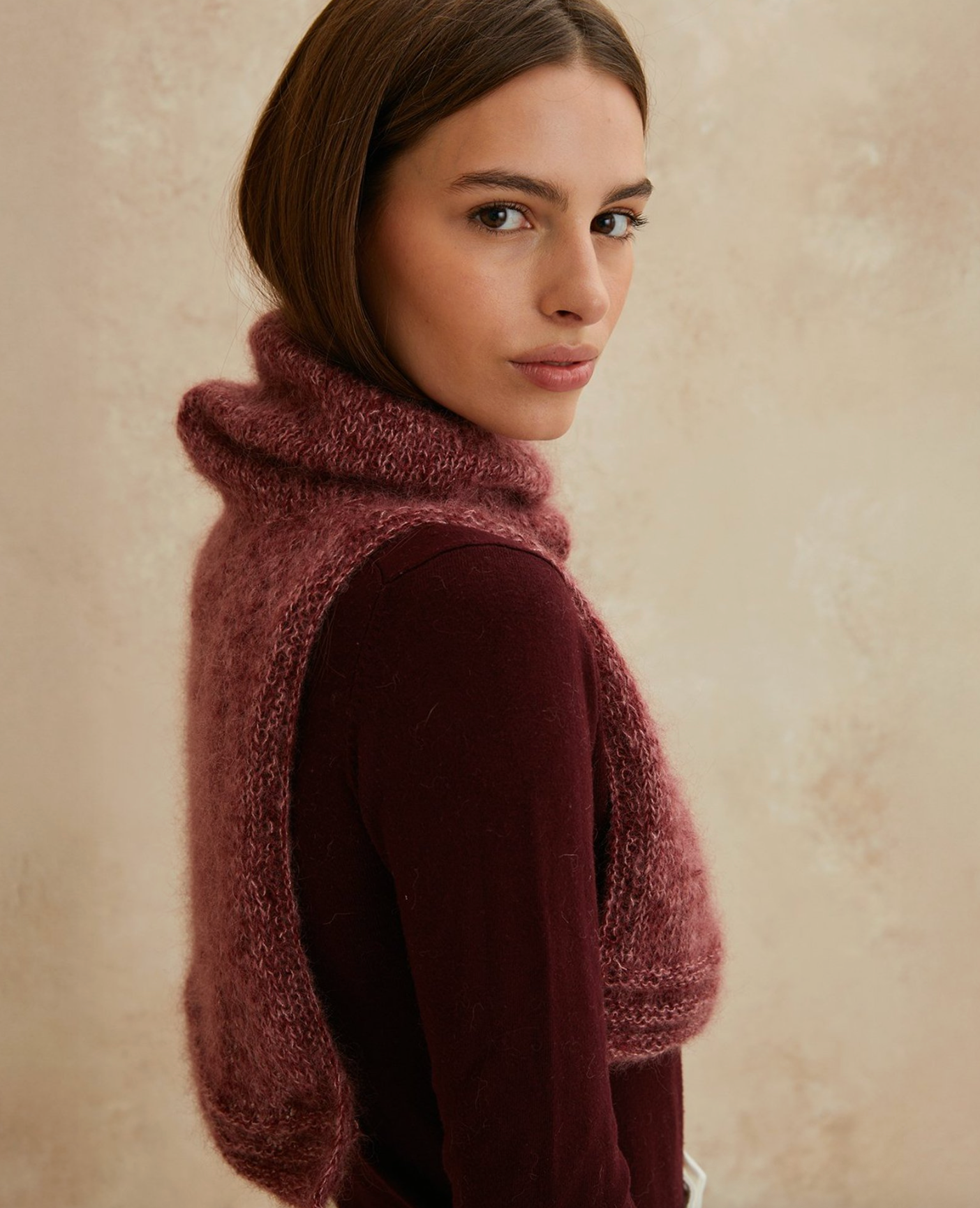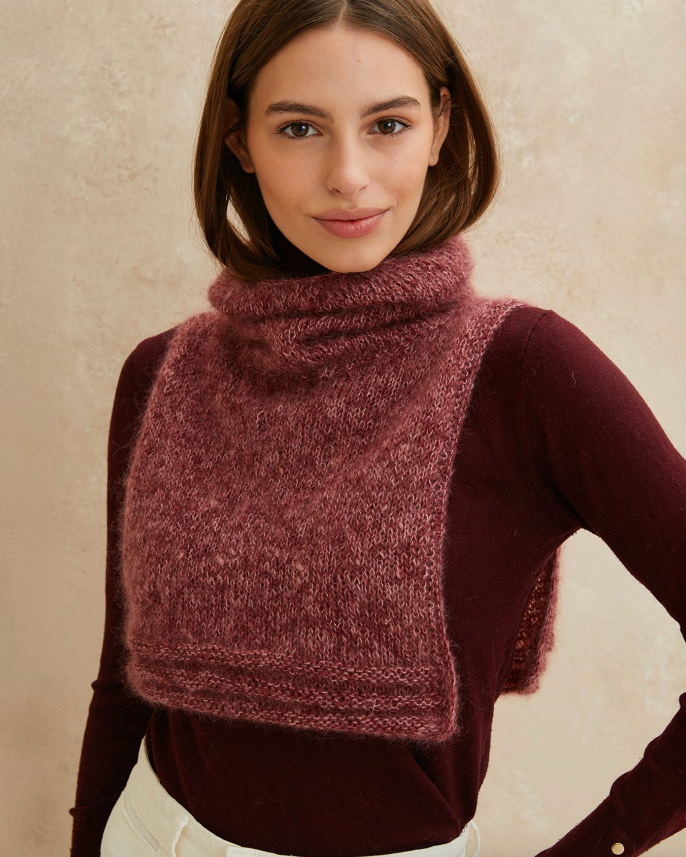 Très doux et aérien plastron large, réalisé avec Phildar Phil Soie Lurex, présenté en coloris Amande et Vieux rose sur les photo. Réalisé en tricot aller-retour en pièces à assembler.