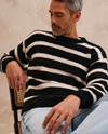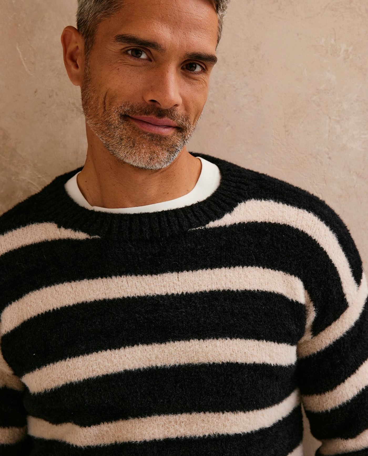 Pull pour homme à larges rayures, réalisé en Phildar Phil Romance, présenté en coloris Noir et Gazelle sur la photo. Réalisé en aller-retour avec pièces à assembler.