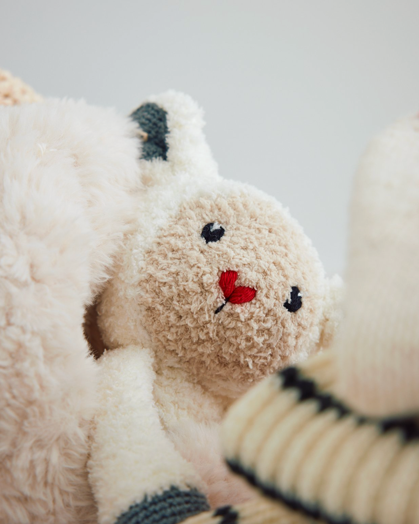Doudou de petit agneau tout doux parfait pour un cadeau de tout petit. Réalisé en Phildar Phil Douce coloris Écru et Brume, Phildar Phil Super Baby en coloris Gris chiné et en Phildar Phil Coton 3 coloris Griotte et Noir présenté sur les photographies.