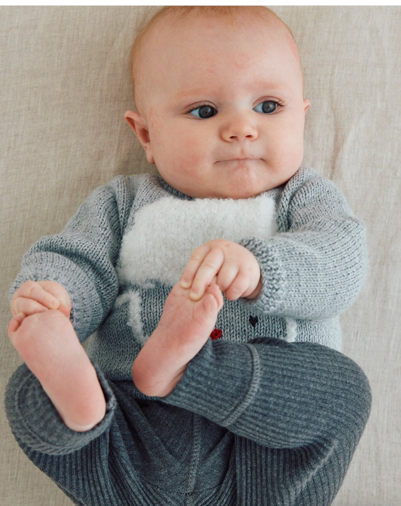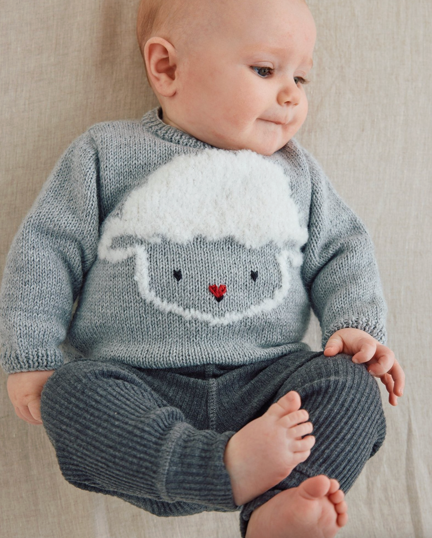 Pull à motif de petit mouton pour bébé, en Phildar Phil Lambswool présenté en coloris Flanelle, en Phildar Phil Chouchou en coloris Craie et en Phildar Phil Coton 3 en coloris Noir et Griotte tel que présenté sur les photos. Réalisé en tricot aller-retour, en pièces détachées à assembler.