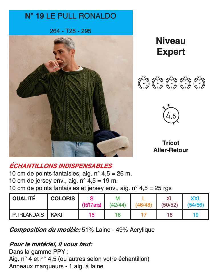 Patron du Pull Ronaldo de Phildar, explications en français, niveau expert, réalisé au tricot.