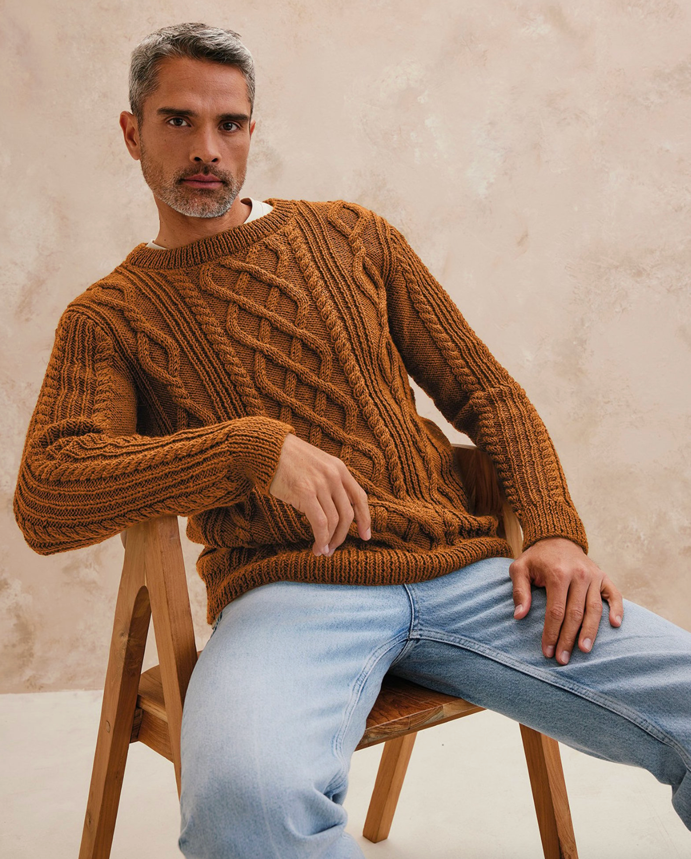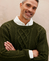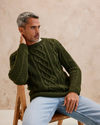 Pull pour homme à plusieurs torsades, classique, réalisé en Phildar Phil Irlandais, présenté en coloris Kaki sur la photo. Réalisé en tricot aller-retour, en plusieurs pièces à assembler.