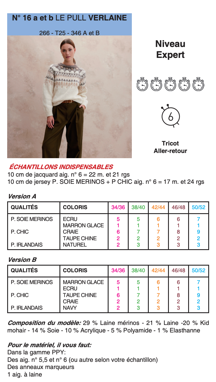 Patron du pull Verlaine de Phildar, explications en français, niveau expert, au tricot.